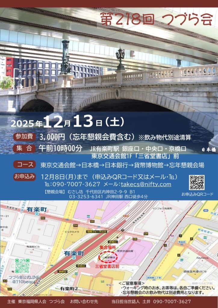 東京福岡県人会の皆さま 大変お世話になります。 今回は「江戸から令和へ商都の道 日本橋歴史散歩」と題しまして、年の瀬の有楽町から京橋・日本橋・神田を巡り「令和の江戸」をお楽しみ頂きます。 ※忘年懇親会は「皇居を走ろ!!同好会福岡」の皆さまと共催です。 |